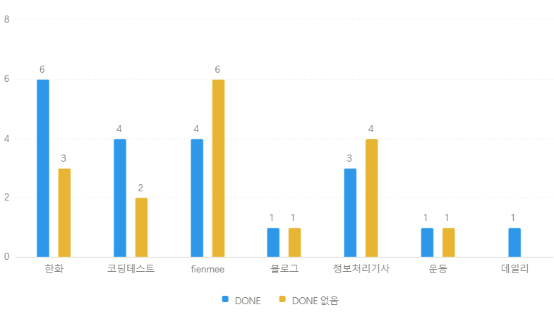 - 대체적으로 하루에 한화 복습 or 코딩테스트 or fienmee or 정보처리기사 이렇게 넷 중에 하나씩만 하는 경향이 강했다. 저번주에는 하루에 두개씩은 했었다. 하루에 목표로 하는 양이 많은 것 같아서 조정에 들어갈 것이다.