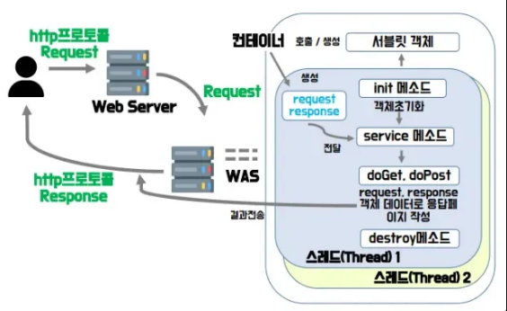 - WAS내부의 servlet container에서 Request, Response 객체를 새로 만들어서 서블릿 객체 호출하고